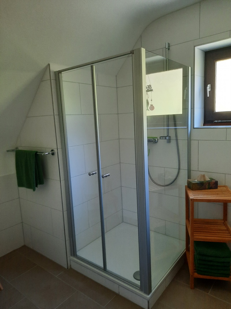 Das 2025 neu renovierte Bad ist mit einer Dusche, einem Kosmetikspiegel, Haartockner sowie einem separaten WC ausgestattet. Für unsere kleinsten Gäste stellen wir auf Wunsch gerne ein Reisebett und einen Hochstuhl bereit. Genießen Sie den Panoramaausblick vom Balkon, der zum verweilen und entspannen einlädt.